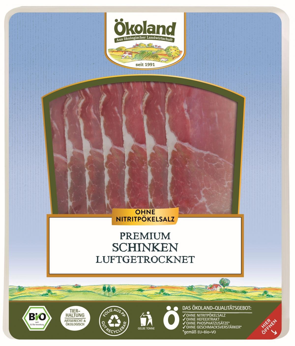 Über 4 Monate im handwerklichen Naturreifeverfahren ohne Nitritpökelsalz gereift, entwickelt der Ökoland Premium Schinken seinen unverfälschten Geschmack. Nur bester Schweineschinken wird hierfür verarbeitet, alles unter strengen Qualitätskontrollen. Bioland-zertifiziert. Ohne Nitritpökelsalz und andere Zusatzstoffe hergestellt. Von Natur aus glutenfrei, laktosefrei, natürliche Hefenbildung durch Fermentation. Innovative Verpackung aus Polypropylen (PP) bewirkt hohe Recyclebarkeit für die Kreislaufwirtschaft von Verpackungsmaterialien.